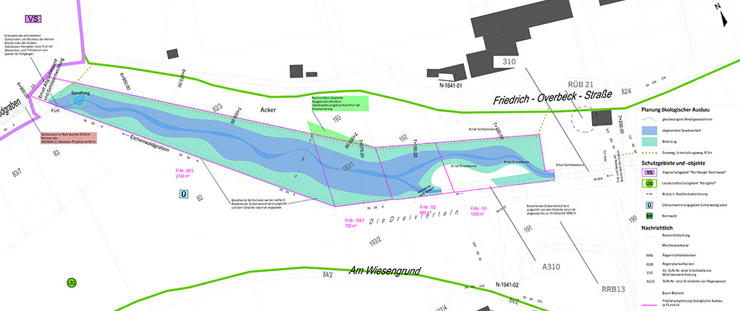 Die Stadtentwässerung Nürnberg (SUN) hatte gemäß einer Genehmigung des Umweltamtes die Aufgabe, den Eichenwaldgraben ökologisch zu verbessern. Hintergrund ist, dass SUN bei Worzeldorf und Pillenreuth bei Überlastung der Regenrückhaltebecken durch Starkregen Mischwasser in das Fließgewässer einleiten darf. Da der Wasserlauf nur eine geringe ökologische Wirksamkeit aufwies (begradigt, mit Betonsohlschalen befestigt) umfasste die Genehmigung die Aufgabe, die Selbstreinigungskraft des Eichenwaldgrabens zu erhöhen.