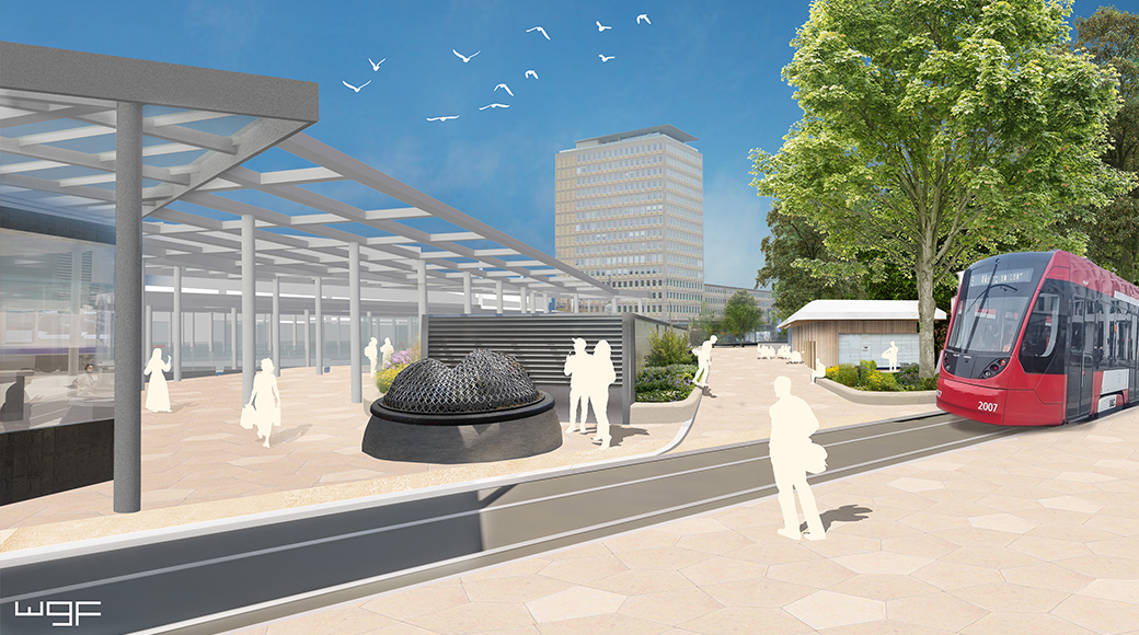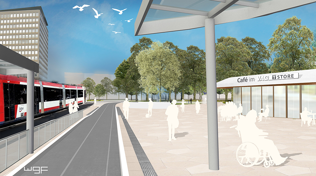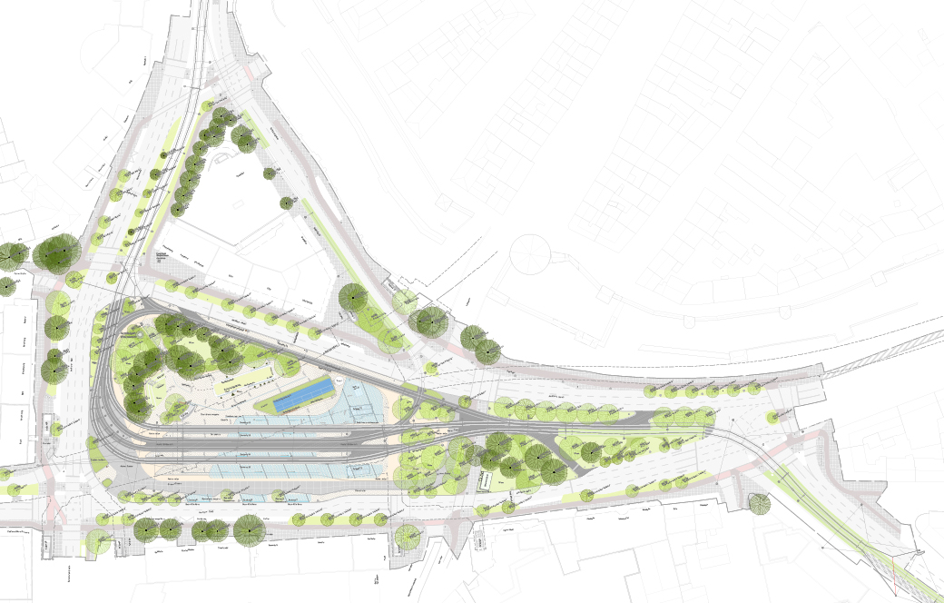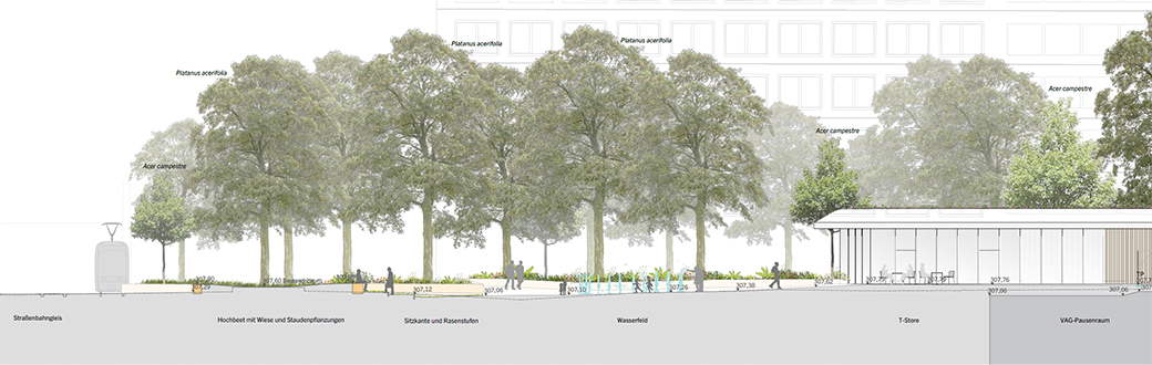 Planungsziel ist es, die Form und Verteilung der Grünvolumen und der bestehenden und neuen raumbildenden Platzelemente einheitlich, lesbar und städtebaulich sinnvoll zu gestalten. Dabei ist auf der großen Plärrerinsel die Blickbeziehung vom Spittlertorturm zum Hochhaus der Städtischen Werke Nürnberg eine zentrale Orientierungsachse, die den Platz in zwei Bereiche teilt. Die große Plärrerinsel ist somit im Nordwesten als großzügiges Grünvolumen konzipiert, das neben der Neupflanzung von Großbäumen in seiner Mitte einen öffentlichen Aufenthaltsraum mit Wasserspiel und Sitzgelegenheiten zur Verfügung stellt. Im Südosten befindet sich als Gegenspieler dazu der Haltestellenbereich, der mit einer einheitlich gestalteten Dachlandschaft zusammengefasst wird. Der Platz auf der großen Plärrerinsel wird durch einen an die organischen Formen angleichbaren, zusammenhängenden Betonbelag markiert.